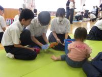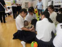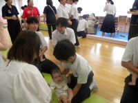HOME > 教育活動 > 学校ニュース > 9/25「9年生 ふれあい体験」 9/25「9年生 ふれあい体験」 入力日2025年10月2日 内容9月25日(水)、家庭科の授業の一環で、子育て支援センターの「でんでんむし」を訪問し乳幼児とのふれあい体験をしました。生徒たちは赤ちゃんを抱っこしたり、準備してきた手作りボールやパペットなどのおもちゃであやしたり、ボール投げを楽しんだりしました。赤ちゃんを触れ合うと自然と笑顔になる生徒たちでした。 閲覧数1,259 前へ 次へ