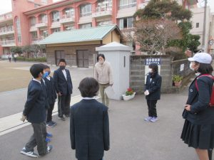 8時ちょっと前に、振り返りを行ってあいさつ運動を終わります。