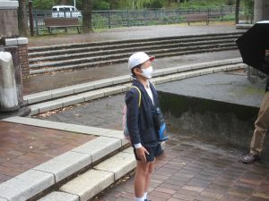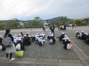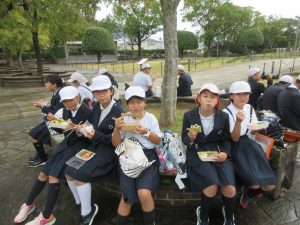 昼食は持参したお弁当を平和公園で食べました。この日の昼食は、「雨の為、駐車場のバスの中で食べた」という学校が多かった中で、多良小学校の昼食時には雨が上がり、平和公園で食べることができました。