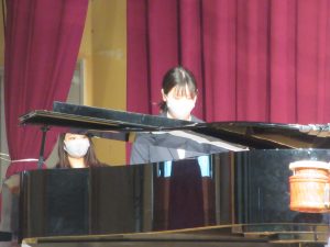 イントロでは、真衣さんがバイオリンを独奏し、演奏では、みんなのオーディションで選ばれた叶人が演奏するボンゴのリズムと横山先生のピアノ伴奏に乗って、みんなの鍵盤ハーモニカの音がホールに響き渡りました。