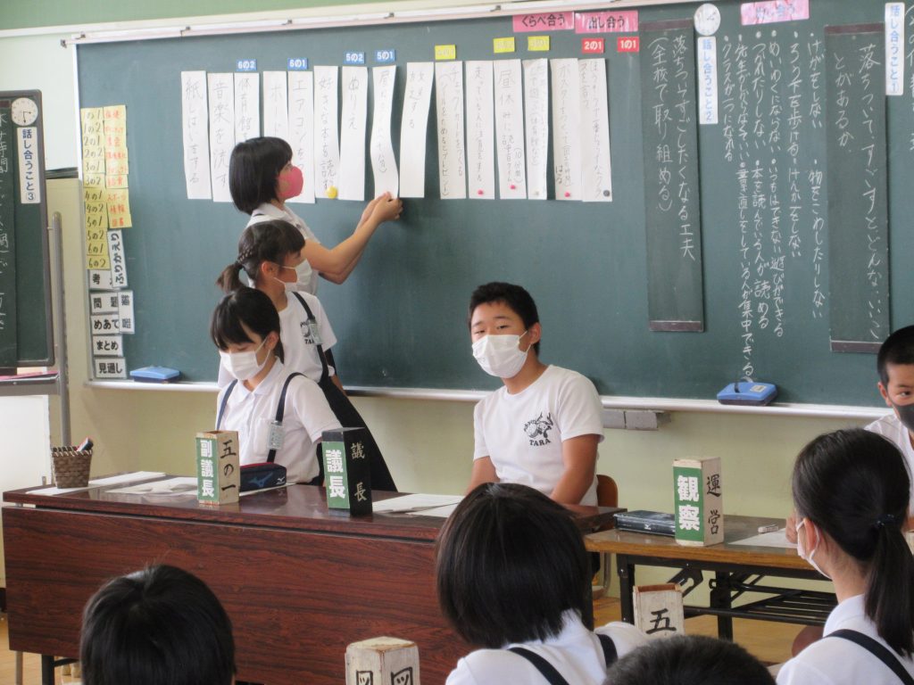 前もって、議題について各学級で話し合った意見を出し合い、それらを比べ合いながら話し合いを進めています。