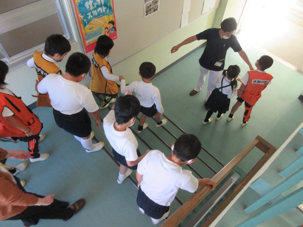 足に装具を付けて、足が不自由な状態を体験しているグループです。実際に階段を上り下りしてみて大変さを実感しました。
