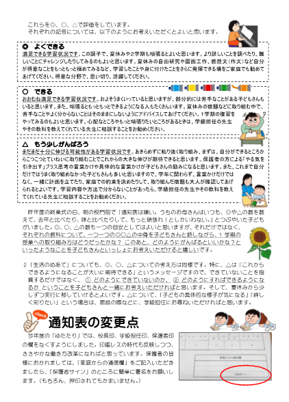 HOME > > 令和3年度 学校便り第13号 令和3年度 学校便り第13号 入力日2021年7月19日 内容学級便りの第13号は、明日(7/20)、配付します通知表「ゆたたり」の見方について紹介しています。 文字だらけになってしまいましたが、とても大切なことですので、ぜひ、ご一読いただきたいと思います。 下のファイルを開いていただくと、拡大してお読みいただけます。 閲覧数678 ファイル ファイルダウンロード 前へ 次へ