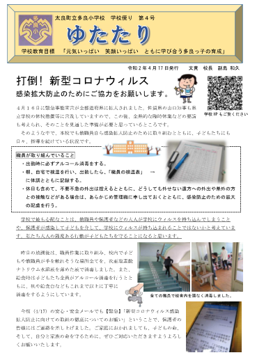 HOME > > 学校便り第4号 学校便り第4号 入力日2020年4月17日 内容学校便りの第4号は、新型コロナウィルスの感染防止のために本校で取り組んでいることと保護者の皆様にお願いしたいことを伝えたいと思い、発行しています。 また、裏面は、学校の臨時休業などの可能性もある中で、子どもたちの家庭学習が充実しますように、佐賀県教育委員会が作成している「家庭学習の手引き」保護者用リーフレットについて紹介しています。ぜひ、家庭でご活用いただければと思います。 それから、今年度の学校行事の変更状況についてお伝えしています。 詳細は下の添付ファイルをご覧ください。 閲覧数483 ファイル ファイルダウンロード 前へ 次へ