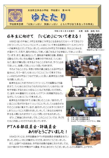 学校便りの第44号は5年生を対象に行いました「いじめについて考える」授業の紹介とPTA本部役員会・評議員会へのご参加の御礼、ヤング川柳、りんり俳句大賞(三学期の部)の入賞者等の紹介です。