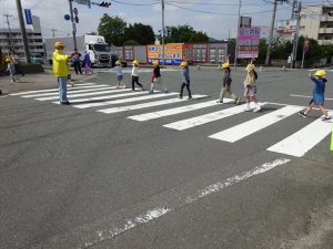 道路の信号の見方・安全な渡り方などをしっかりと確認しました。横断歩道も手を挙げて