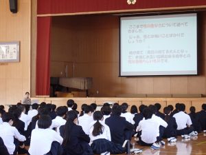 HOME > 開かれた学校 > 学校生活 > 第2学年 性教育講演会(10/28) 第2学年 性教育講演会(10/28) 入力日2025年10月28日 閲覧数42 10/28(火)6校時、産婦人科の助産師を講師にお招きして、性教育講演会を実施しました。思春期の心と体や、性感染症の予防、いのちの大切さ等についての話を分かりやすくしていただき、生徒は、性について考えるよいきっかけとなりました。 前へ 一覧へ戻る 次へ