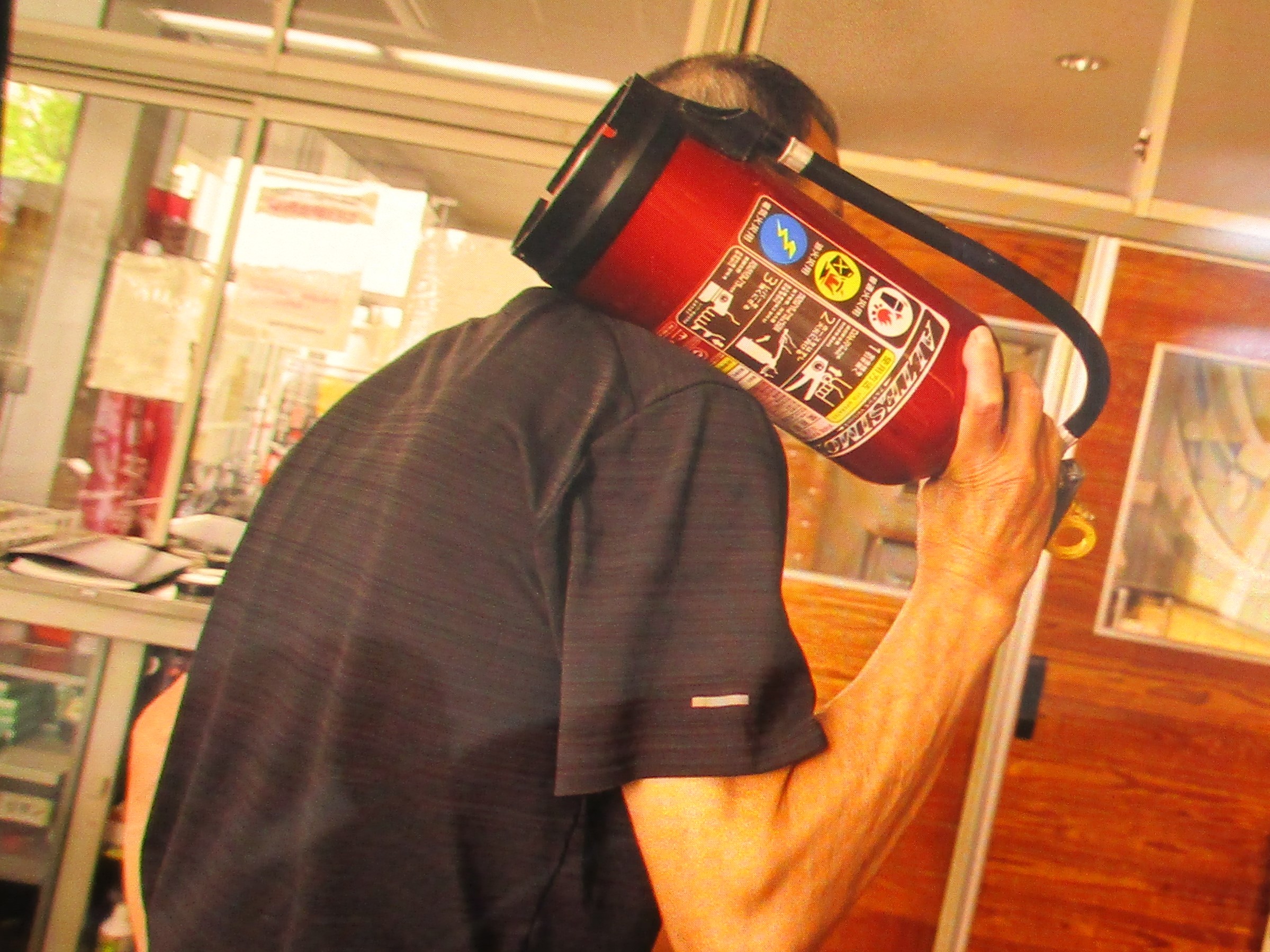 事務室から消火器を担いで走って消火活動に向かう先生(職員も真剣です)