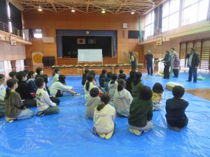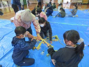 12月11日(木)に「しめ縄づくり体験」があり、4年生と5年生が参加しました。これは、唐津農林事務所の「ふるさと『さが』水と土探検支援事業」の活動で、「さつまいもの収穫体験やしめ縄づくり体験を通じて、子どもたちの農業農村に対する理解や興味を深め、ふるさとの農業や自然環境について関心をもつ人になってもらう」を目的として行われているものです。