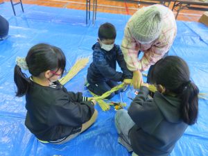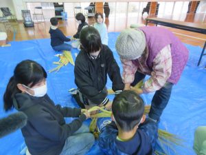 農林事務所、鎮西市民センター、石室・名護屋地区の方の協力のもと、グループに分かれて「しめ縄づくり体験」に取り組みました。作り方の一つ一つの手順を丁寧に教えてもらいながら、友達と協力して作業を進め、一人にひとつずつのしめ縄を完成させることができました。