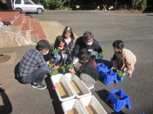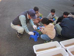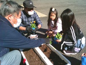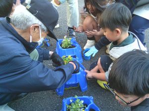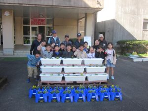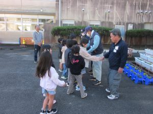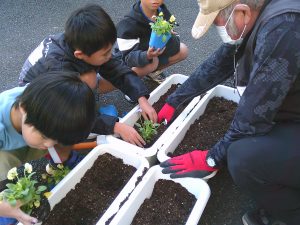 10月24日(金)に1年生を対象とした「世代間交流」が行われました。これは、唐津市社会福祉協議会北部支所で実施されている世代間交流事業の活動です。今回の花植え交流の活動には、老人クラブ鎮西支部より5名の方が来てくださいました。