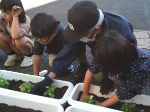 3つのグループに分かれて、ビオラの花苗とチューリップの球根をプランターや植木鉢に植えました。植え方を教えてもらったり、楽しくお話をしたりしなが ら一緒に作業を進め、交流を深めることができました。