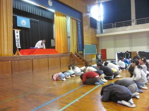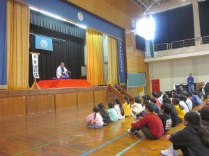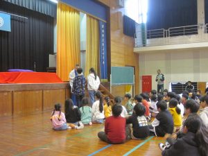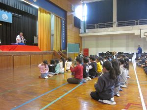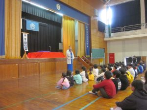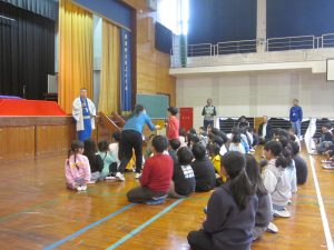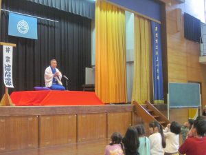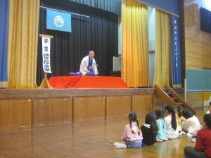 11月17日(月)に「落語会」がありました。これは、唐津市文化事業団による「芸術文化におけるワークショップ事業」として行われているものです。今回は「国内の第一線で活躍されている落語家を招いて小学校を訪問し、落語の所作などを体験する」として落語会が行われました。
