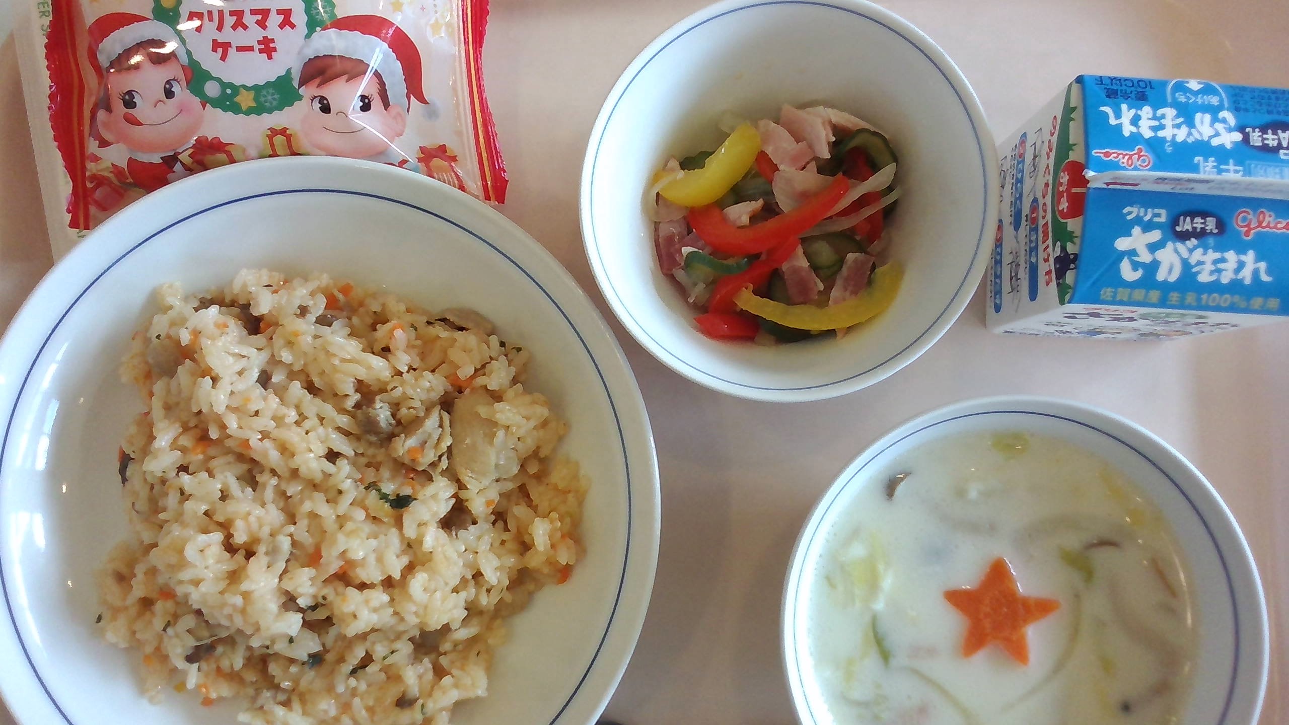献立名:チキンピラフ 牛乳 ハムのマリネ 白菜のクリームスープ セレクトクリスマスケーキ(チョコまたはいちご)