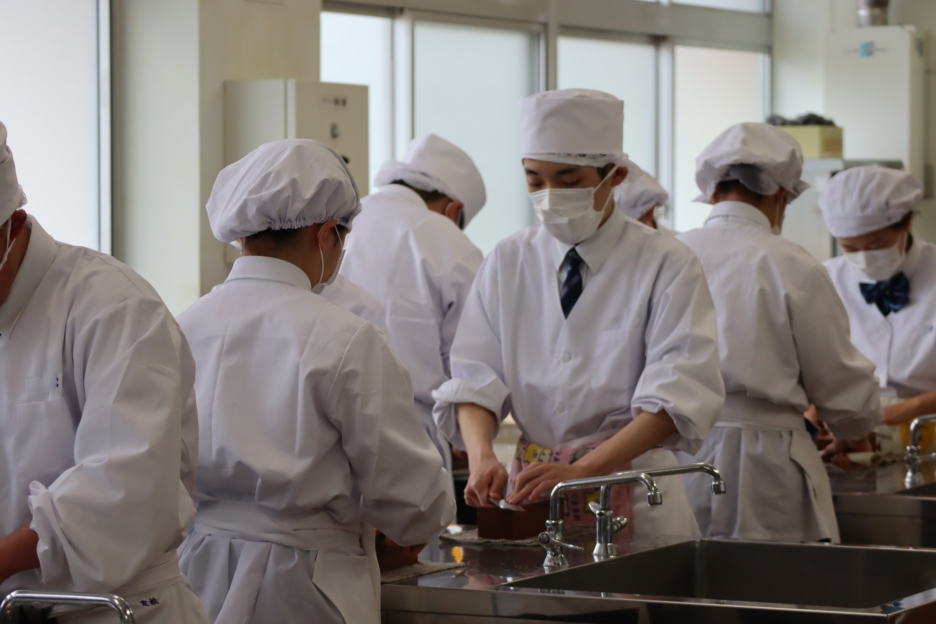 HOME > 学校の様子 > 学校の様子 > 1年 食品調理科【実習が始まりました!】 1年 食品調理科【実習が始まりました!】 入力日2026年4月20日 閲覧数105 実習が始まりました!前日の放課後、実習の心構えや実習着の着装などのオリエンテーションを受けたのち、いよいよ調理の授業が始まりました。 実習前には、身なりや手洗いの指導も受けました。 さて最初の授業は包丁の手入れから行いました。購入時の油を洗剤で丁寧に洗って落とし、砥石で刃を研ぎました。砥石を使っての包丁研ぎは初めてで、慣れない手つきでしたが頑張りました。 これから3年間使用する包丁、大切に扱っていきます。 前へ 一覧へ戻る 次へ