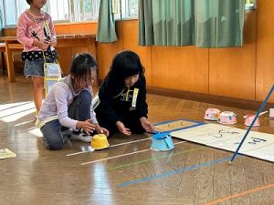 1年生、2年生 「おもちゃまつり」 2年生がおもちゃの店を開きました。お客さんは1年生です。店の人もお客さんも楽しんでいました。