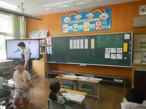 1年生 算数 「たしざん」 先生が黒板に書いた問題をノートに写しました。こんなこともできるようになったのですね。1年生之進化にまたまた驚きました。