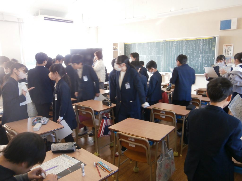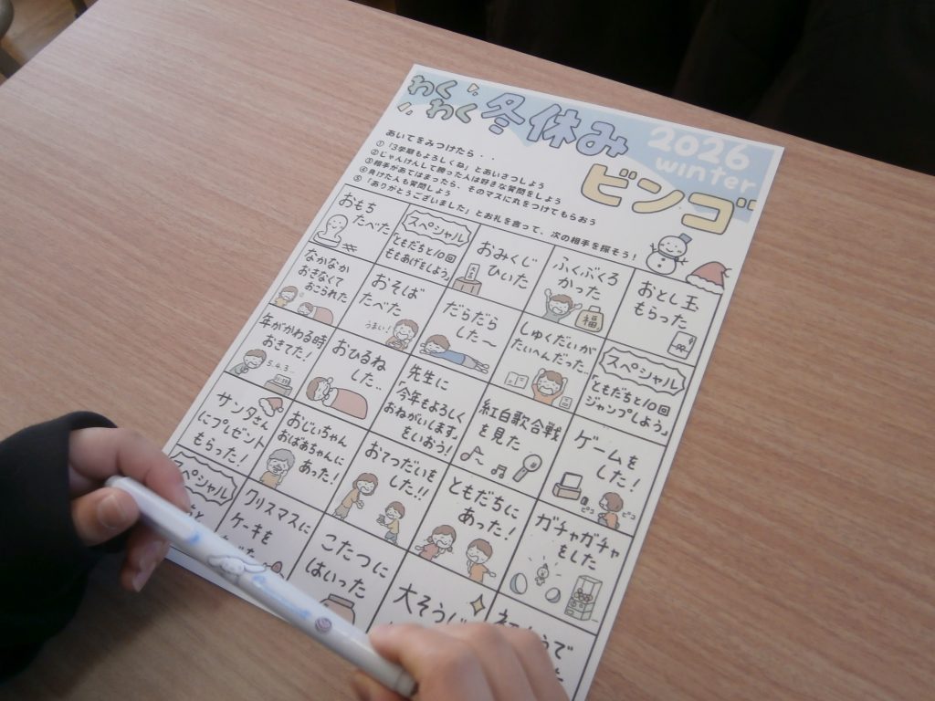 5年生の教室では、冬休みビンゴをして「お餅食べた?」「おじいちゃんやおばあちゃんと会った?」と友達と冬休みのことについて、尋ね合っていました。