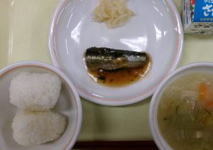 おにぎり 牛乳 いわしのおかか煮 たくあん みそ汁