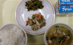 ごはん 牛乳 がめ煮 高菜炒め もつ鍋風スープ