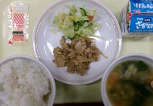 ごはん 牛乳 若楠ポークのしょうが焼き れんこんの白和え キャベたま汁