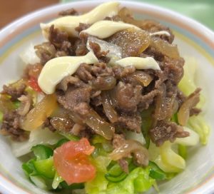 ごはんにお肉、野菜をのせて、マヨネーズをかけて食べます!