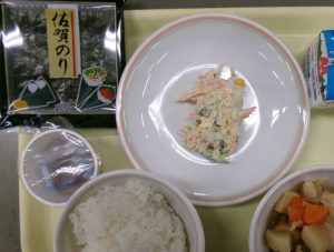 ご飯 牛乳 おでん風煮 野菜とツナのマヨ和え 納豆 佐賀のり