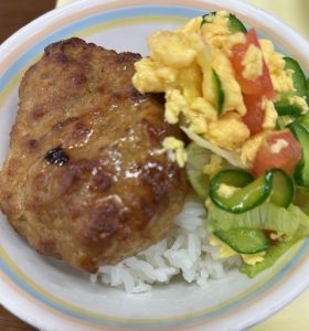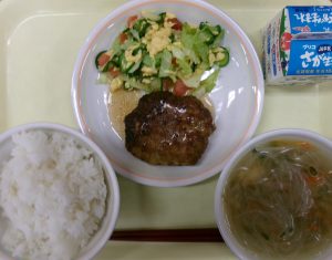 ロコモコ風(ご飯・ハンバーグ・野菜) 牛乳 チキンロングライススープ