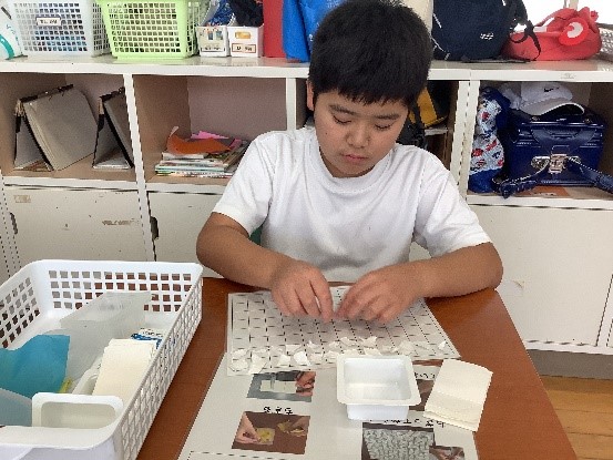 HOME > 小学部 > 小学部だより > 生活単元学習「かみすきをしたよ」(5年生) 生活単元学習「かみすきをしたよ」(5年生) 入力日2025年11月6日 内容5年生では、使い終わった牛乳パックを活用して、紙すきでカード作りに取組みました。ちぎり班、ミキサー班、紙すき班とそれぞれ役割分担をし、学年で協力して頑張りました。 それぞれ分担した役割を繰り返すことで作業も上手にできるようになり、20~30分黙々と取り組みました。 閲覧数151 前へ 次へ